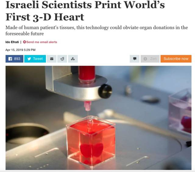 Tel Aviv University in Israel announced that it has used human tissue to 3D print the world's first complete heart, which includes cells, blood vessels, heart and ventricle. There have been 3D printed hearts before, but none of them printed blood vessels, hearts or cells.