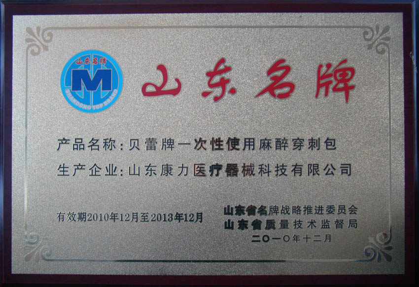 我公司生產(chǎn)的貝蕾牌一次性使用麻醉穿刺包被評(píng)為“山東名牌”產(chǎn)品。