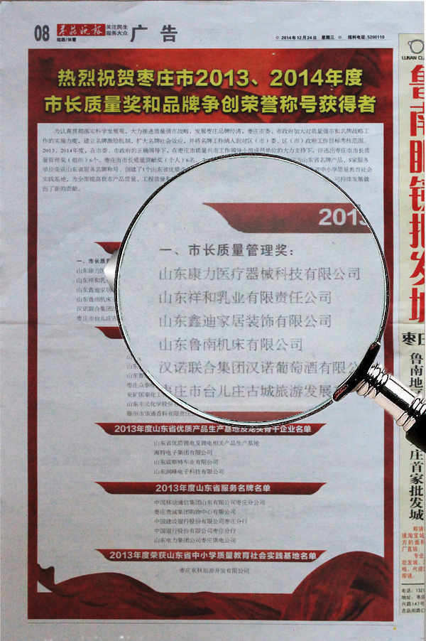 熱烈慶賀山東康力醫(yī)療器械科技有限公司榮獲2013、2014市長質(zhì)量獎,自2009年首屆山東省省長質(zhì)量獎頒獎大會以來,棗莊市借鑒其他各地市的先進經(jīng)驗,結(jié)合當?shù)貙嶋H,制定有利于推動棗莊經(jīng)濟發(fā)展的“市長質(zhì)量獎”。此獎項為棗莊市人民政府設(shè)立的最高質(zhì)量榮譽獎,也是棗莊第一個以“市長”的名義命名的政府獎勵項目,主要授予棗莊市具有法人資格、實施卓越績效模式、有廣泛的社會知名度與影響力、在行業(yè)內(nèi)處于領(lǐng)先地位、取得顯著經(jīng)濟效益和社會效益的企業(yè)或組織,包括提供公共服務(wù)的非政府機構(gòu)。公司獲得此項榮譽,是市級領(lǐng)導對公司成績的充分肯定。