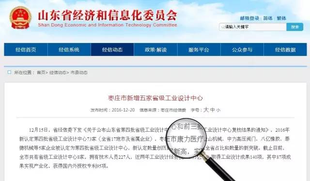 根據(jù)《山東省省級(jí)工業(yè)設(shè)計(jì)中心管理辦法》(魯經(jīng)信產(chǎn)﹝2014﹞121號(hào)),經(jīng)各市經(jīng)信委現(xiàn)場(chǎng)審核及專家評(píng)審,山東康力醫(yī)療器械科技有限公司被山東省經(jīng)濟(jì)與信息化委員會(huì)認(rèn)定為省級(jí)工業(yè)設(shè)計(jì)中心。