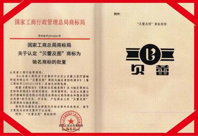 3月15日,棗莊市全市質(zhì)量工作會(huì)議在市政大廈二樓報(bào)告廳隆重召開,會(huì)上市政府領(lǐng)導(dǎo)向康力醫(yī)療頒發(fā)了“中國馳名商標(biāo)”證書。康力醫(yī)療“貝蕾及圖”商標(biāo)被國家工商總局商標(biāo)局正式認(rèn)定為中國馳名商標(biāo),標(biāo)志著康力醫(yī)療在品牌建設(shè)工作上又取得了新的突破,實(shí)現(xiàn)了品牌經(jīng)營道路上又一次質(zhì)的飛躍。