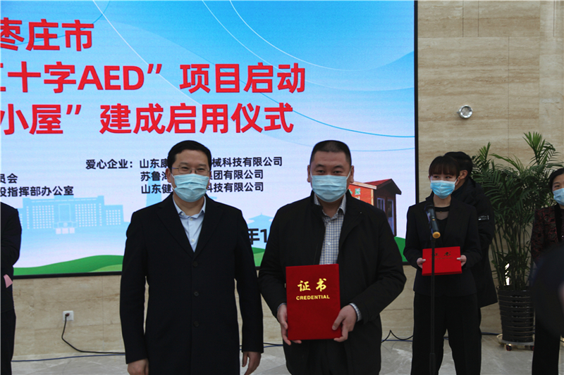 啟動儀式上,王凌常務(wù)副會長代表棗莊市紅十字會向棗莊市健康辦轉(zhuǎn)贈了20臺AED設(shè)備,劉吉忠副市長為愛心捐贈企業(yè)頒發(fā)證書,康力醫(yī)療營銷總監(jiān)呂作斌代表公司上臺領(lǐng)受捐贈證書。