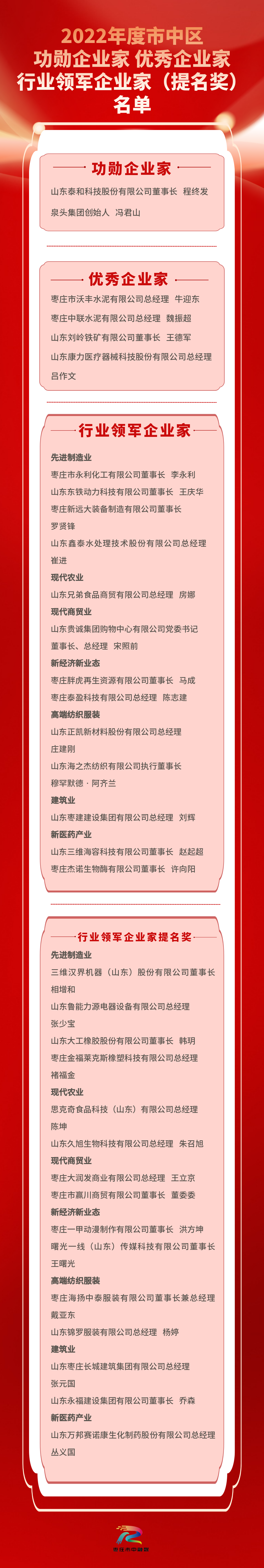 關(guān)于表彰2022年度市中區(qū)功勛企業(yè)家優(yōu)秀企業(yè)家和行業(yè)領(lǐng)軍企業(yè)家(提名獎)的決定